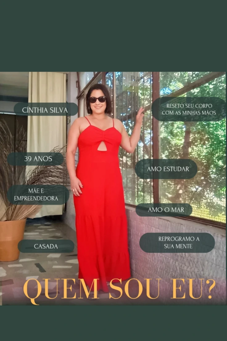 Meu nome é Cinthia Silva, sou terapeuta integrativa e corporal, com atuação em massoterapiMeu espaço e estética, unindo técnicas manuais e recursos terapêuticos para promover bem-estar, alívio de dores e valorização da beleza natural.